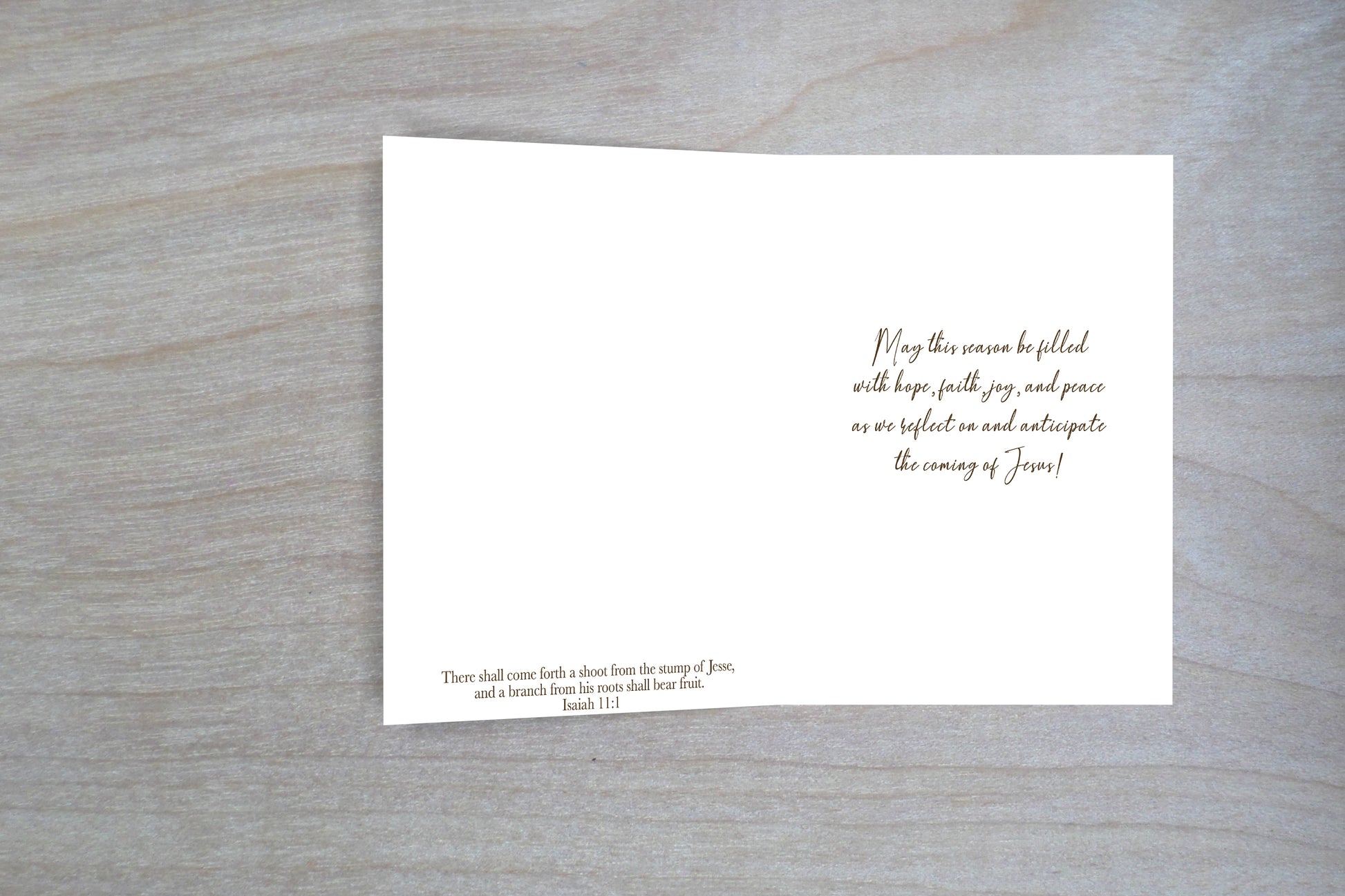 The journey from creation to the birth of Christ is depicted in our 25 Days of Christmas Card. The front of the card features symbols represented in the Jesse Tree telling the story of God's plan of redemption through His Son, Jesus, along with "Merry Christmas, come thou long expected Jesus". The inside of the card quotes Isaiah 11:1 "There shall come forth a shoot from the stump of Jesse, and a branch from his roots shall bear fruit" and has the message, "May the season be filled with hope, faith, joy, and peace as we reflect on and anticipate the coming of Jesus!" Great cards for Sunday School Class, friends, and/ or family reminding them of the reason we celebrate this Christmas season. When folded, the card measures 5x7 inches. Includes 20 cards and envelopes. Made in the USA