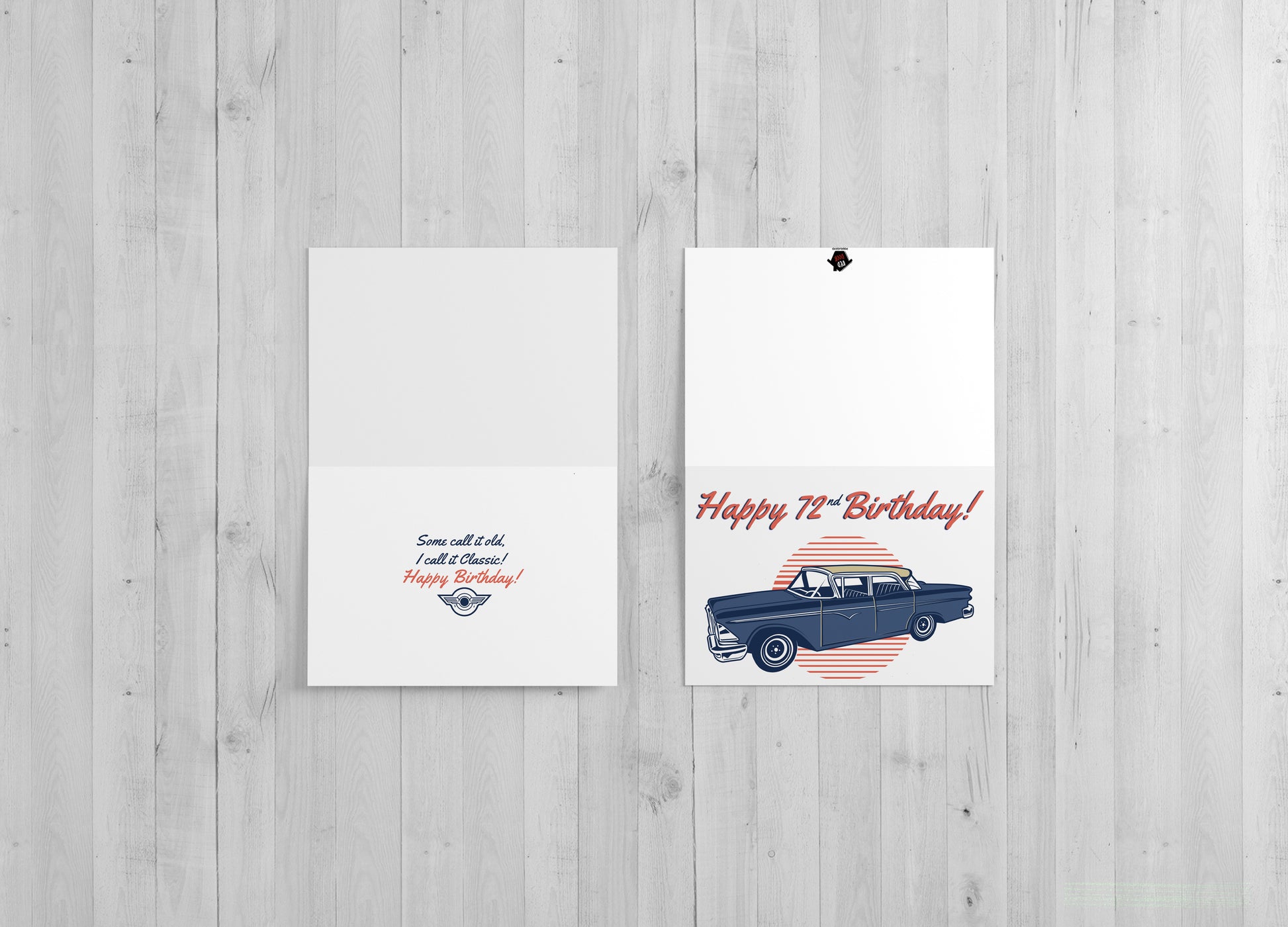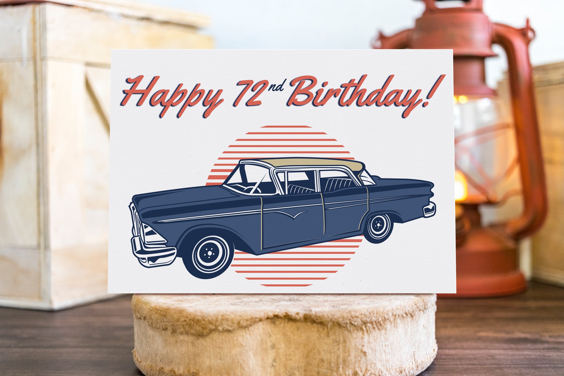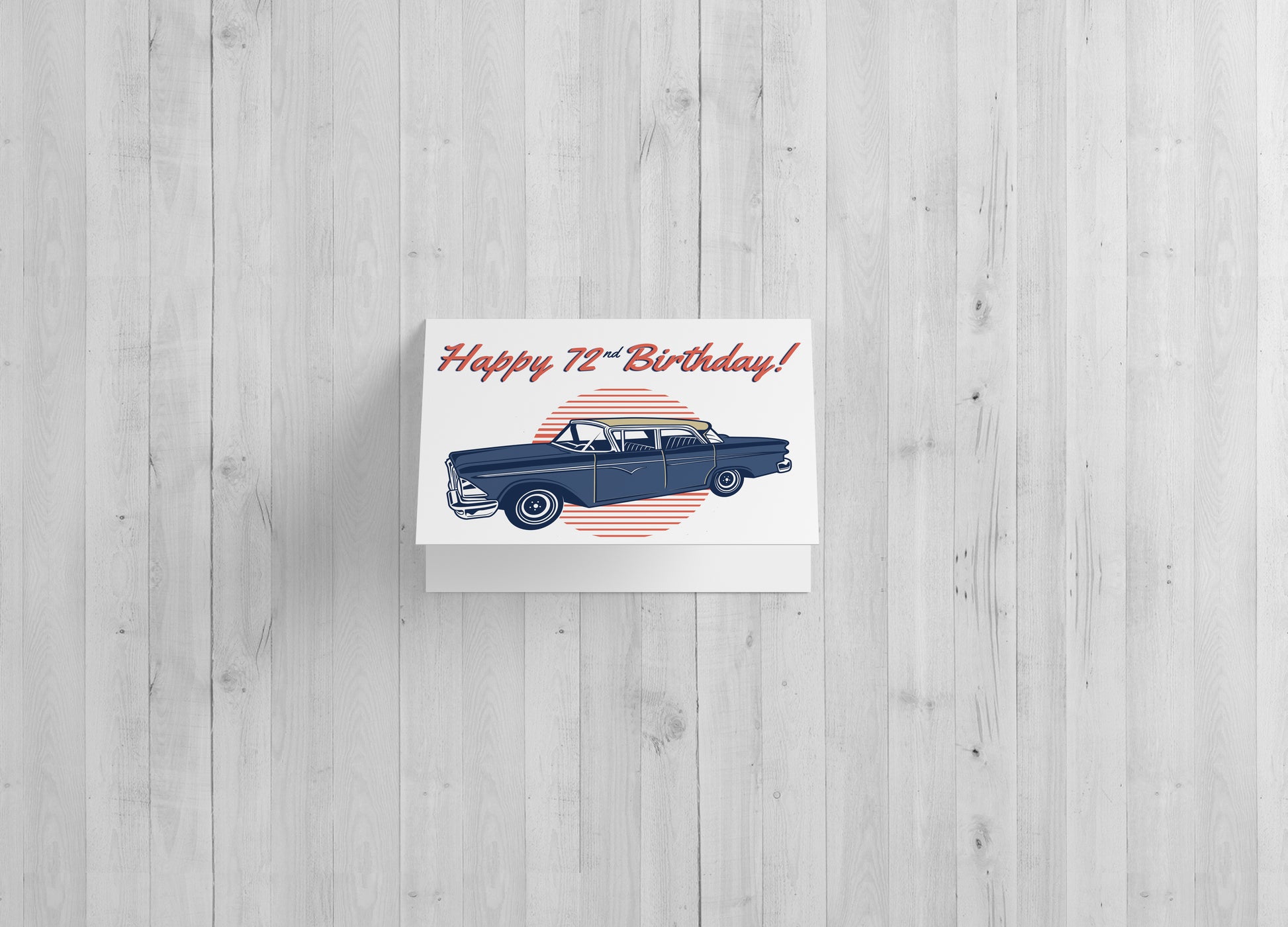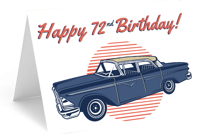 Celebrate the birthday of the new 72 year old with our Vintage Car Birthday Card. The retro themed elements make this card the perfect card to send! Sporting a schnazzy classic hot rod, the card elicits cheerful Happy Birthday Greetings. The inside of the card has the message, "Some call it old, I call it Classic!". The 5x7 inch card is printed on card stock. Made in the USA!