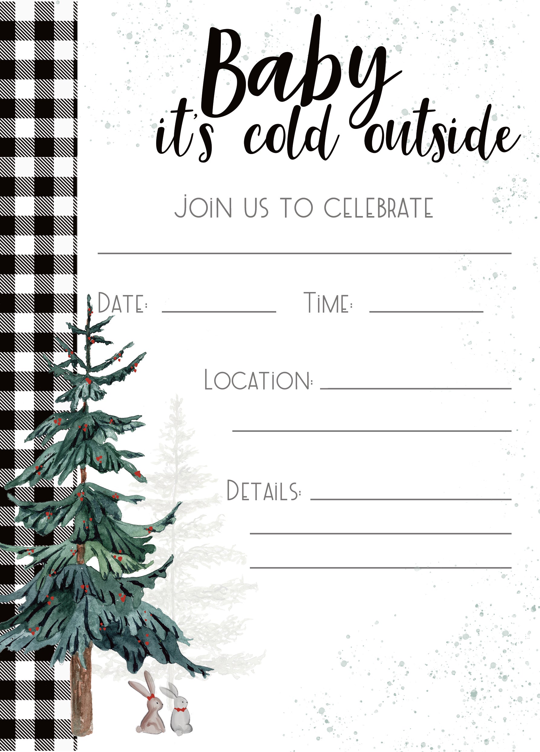 Celebrate your winter events with this trendy Black and White Buffalo Plaid invitation featuring the phrase "Baby It's Cold Outside". Write your event details on these originally designed invitations. Made in the USA!