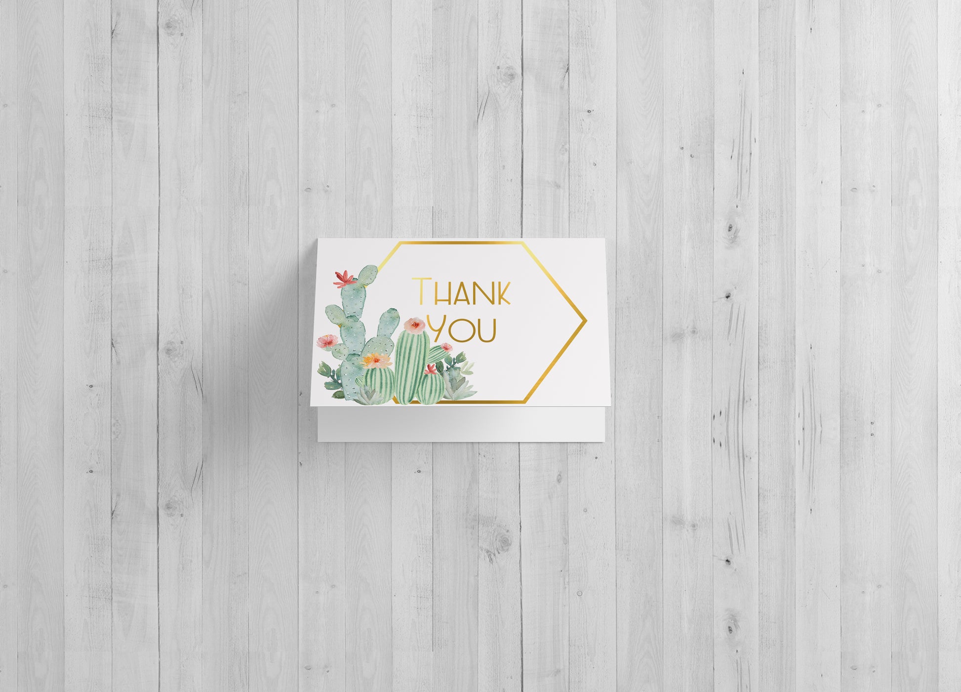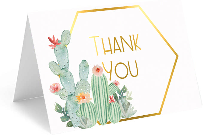 The Cactus Thank You Cards are perfect for extending thanks for wedding gifts, baby shower goodies, or any other reason to express your gratefulness! The gold Thank You and frame are NOT foil, but are the perfect mix of elegance and fun with a burst of sophistication. The recipients will be delighted to find a personal message written on the blank inside of the card. When folded, each card measures 4x6 inch. Made in the USA!