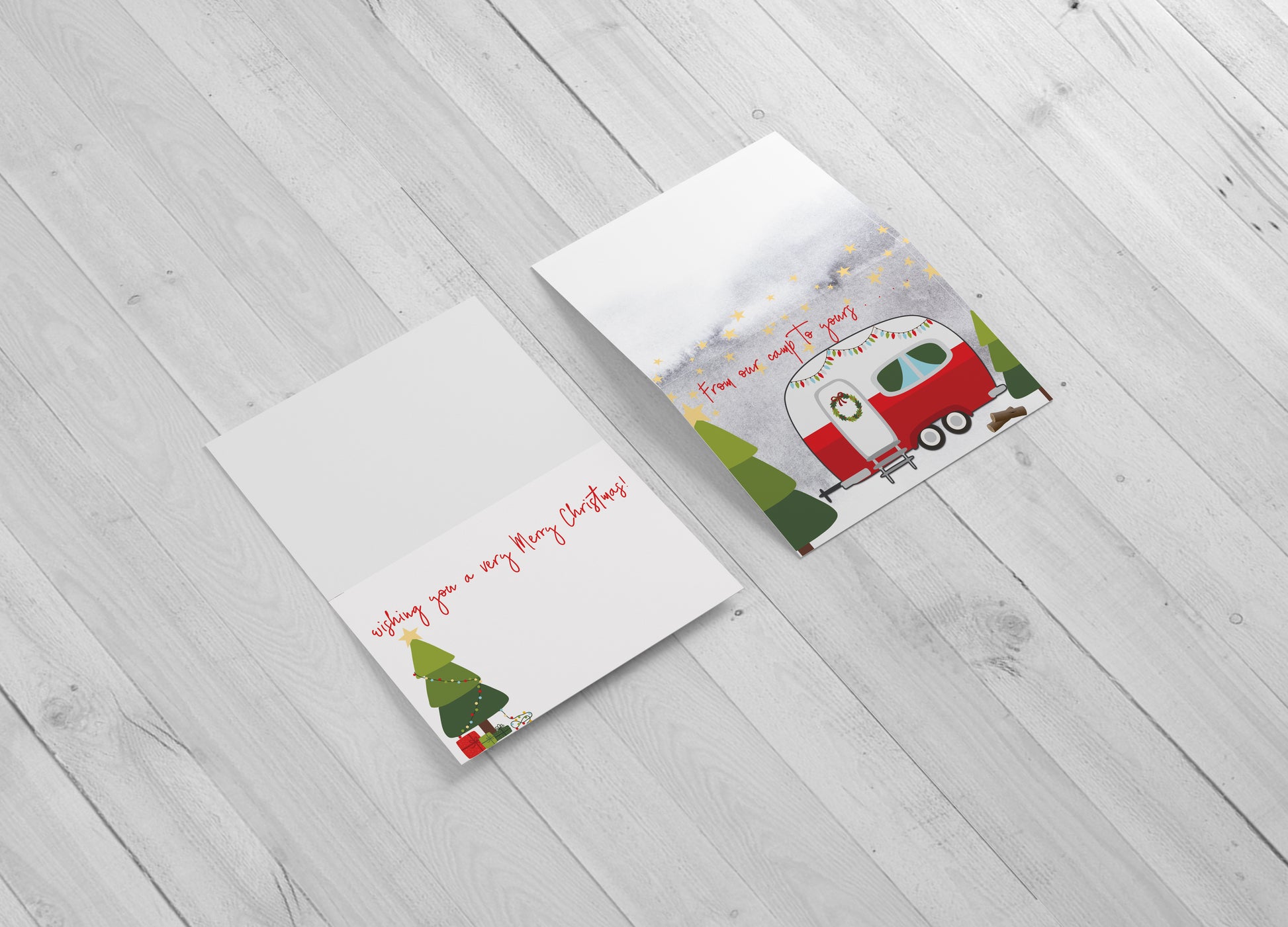 No matter where you are, you can send your holiday greetings this year with this festive Camper/RV Christmas Card. The card has a glossy finish on the outside and reads "From our camp to yours." The inside of the card has the message, "wishing you a very Merry Christmas and is uncoated for easy writing. The cards arrive flat but are pre-scored for easy folding. Made in the USA!