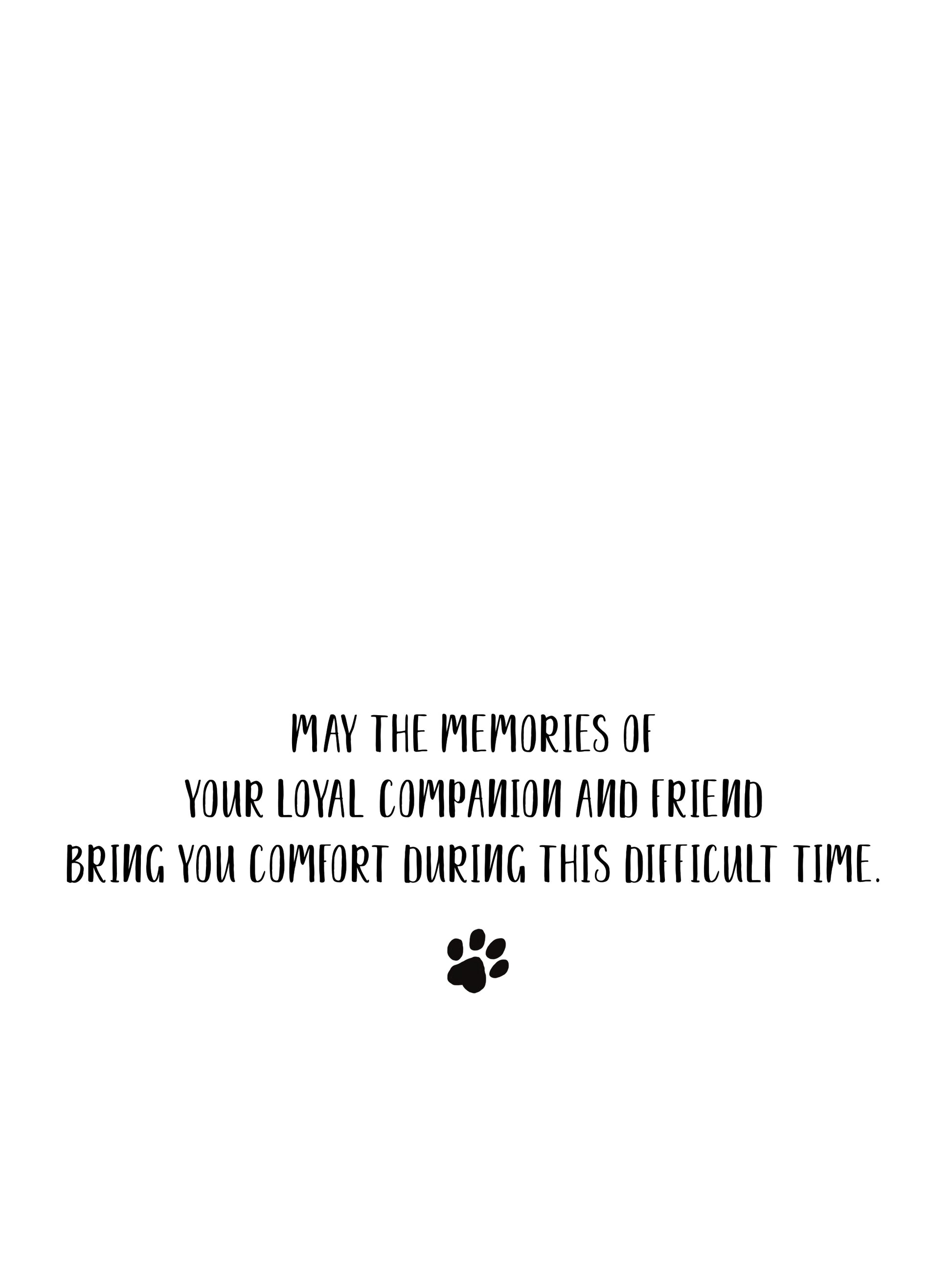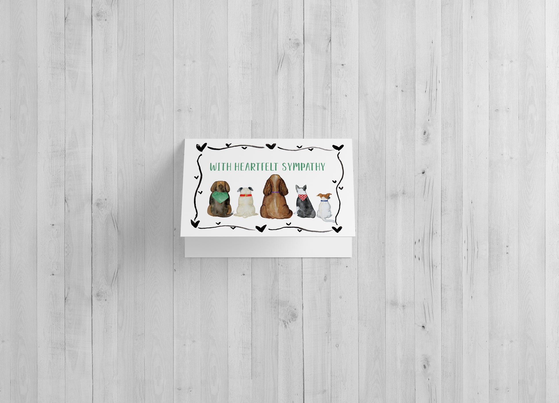 Losing a part of the family is not easy. Let these fur friends warm your recipient heart and let them know you are thinking about them during this time. The front of the card has the backside of five different breeds of dogs with the words "With Heartfelt Sympathy". The inside of the card has the message, "May the memories of your loyal companion and friend bring you comfort during this difficult time." Card is printed on card stock. 4"x6" Design. Includes one single card and envelope. Made in the USA!