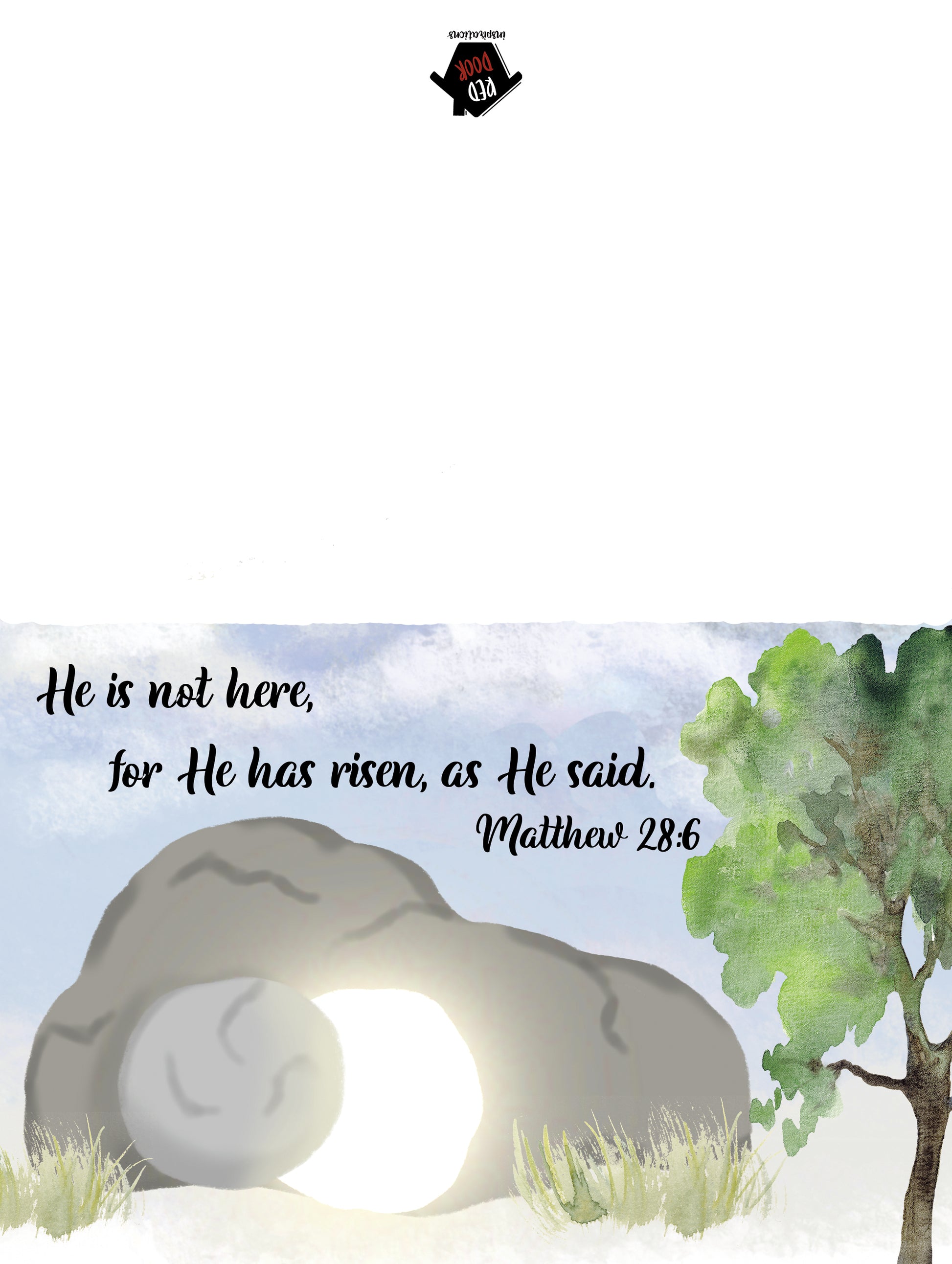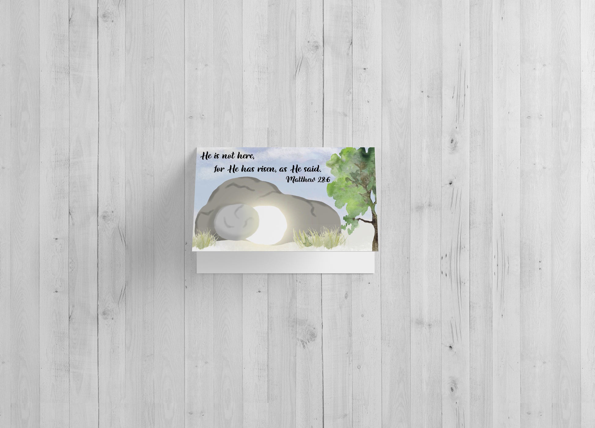 Celebrate our risen Savior! The front of the card features a bright light in an empty tomb. Matthew 28:6 is included on the front "He is not here, for He has risen, as He said." The inside of the card is blank making these cards perfect for commemorating Easter, Baptisms, Sympathy or Christian encouragement. There are 20 cards and envelopes/. The cards are printed on card stock and will arrive flat, they are pre-scored and fold to a 4x6 design. Made in the USA!