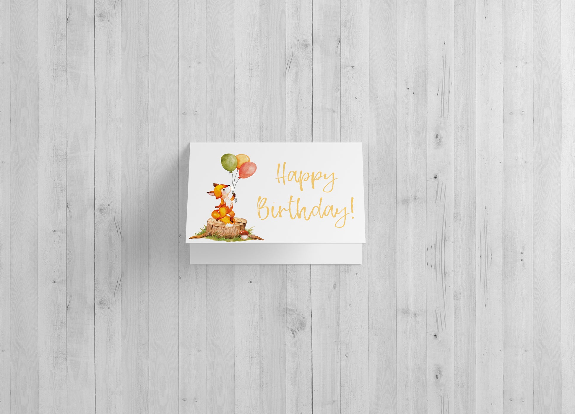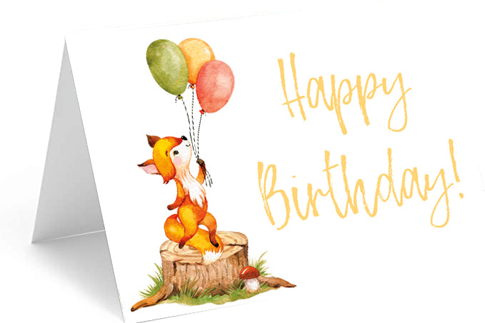 Send a Happy Birthday greeting with these playful, fox birthday cards. The design features a cute baby fox holding balloons and the words, "Happy Birthday!" This woodland style card is perfect for wishing friends, family, co-workers, neighbors, classmates, and playmates a Happy Birthday. The card is printed on card stock and is pre-scored to fold to a 4" x 6" card. There are 20 cards and envelopes included.