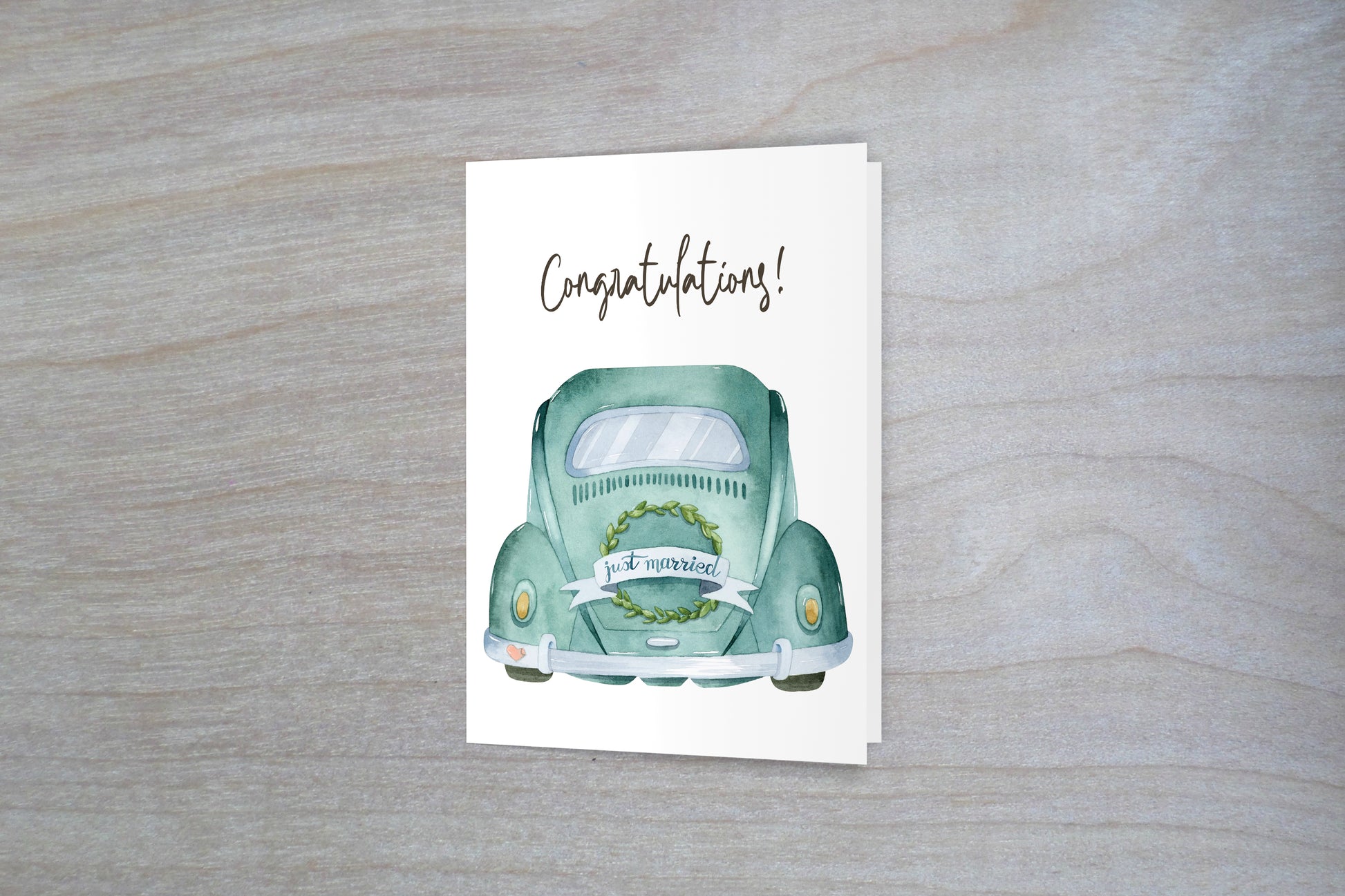 Send this classy card to the happy couple in your life to join in with them in their celebration. Featuring a vintage punch bug with a banner saying 'Just Married' as well as the word 'Congratulations' in a scripty font at the top. The inside of the card shows an artistic array of flowers and greenery along side a pre-written message to the bride and groom. For both the shower or the big day, this card is the perfect way to congratulate their tying the knot.
