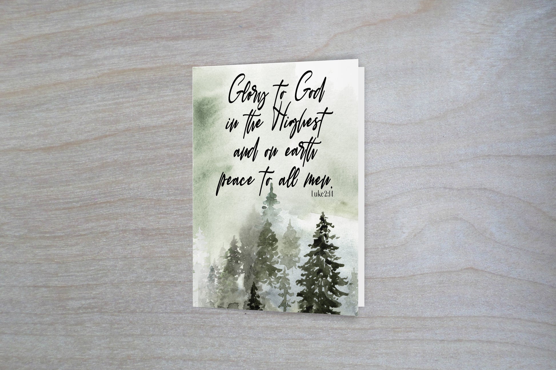 Glory to God in the Highest Christmas Cards not only let friends and family know you are thinking about them during the Christmas season, but also remind them of the greatest gift given - Jesus Christ. The outside of the card features evergreen trees and Luke 2:14 "Glory to God in the Highest and on earth peace to all men." The inside of the card has the message, "May the Prince of Peace fill you with His peace as you reflect on Him - the greatest gift of all! Merry Christmas!" Cards arrive flat and are prescored for easy folding. When folded, the cards are 5x7 inch. Printed on uncoated card stock. Includes 20 cards and envelopes. Made in the USA!