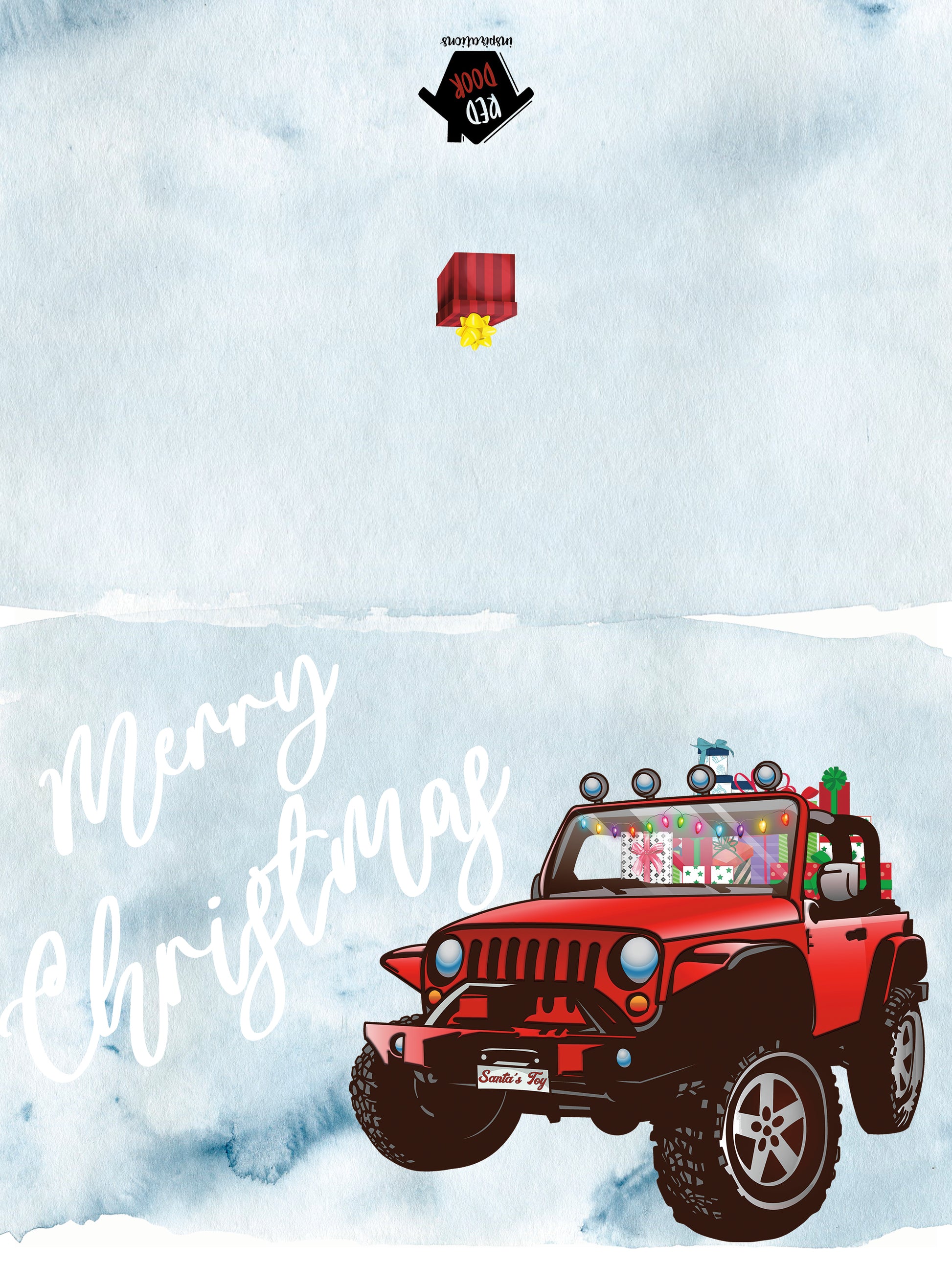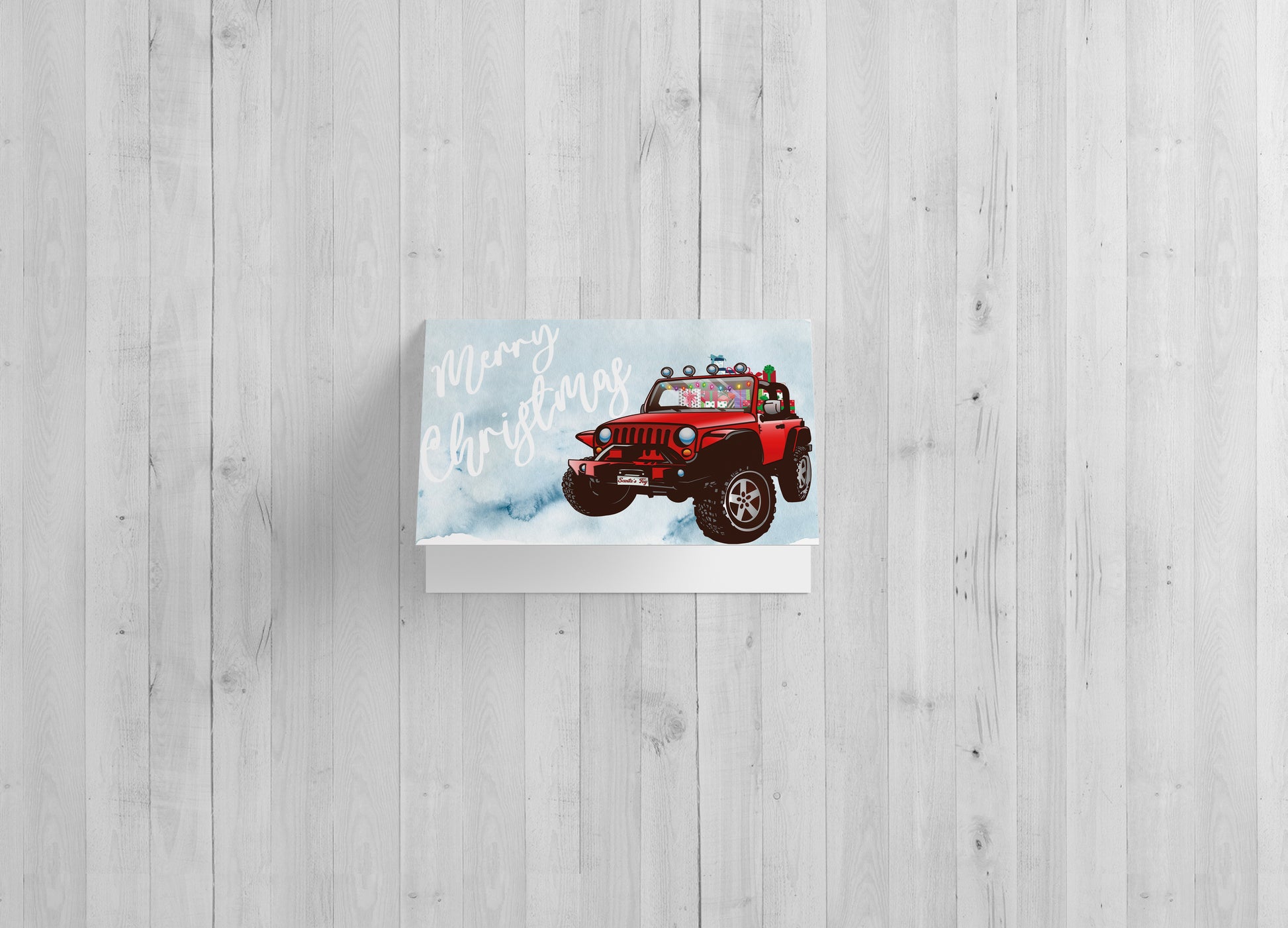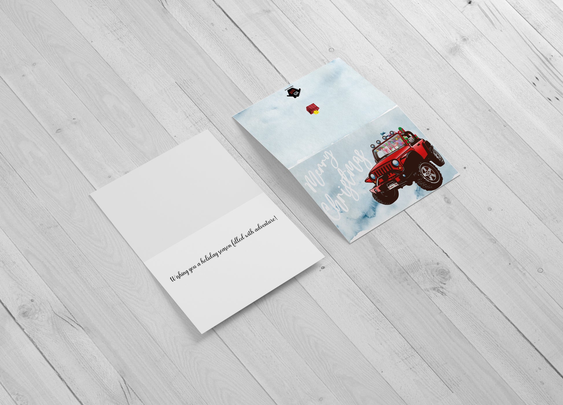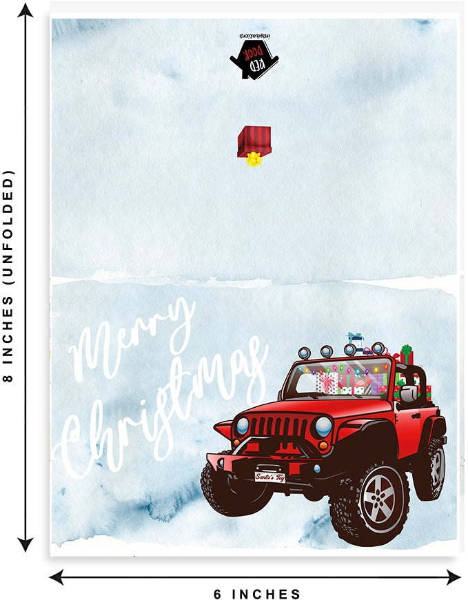 Send out your Christmas Holiday greetings with this fun, festive Jeep Christmas Card. The outside of the card has a glossy finish and features a red jeep filled with gifts and "Merry Christmas." The inside of the card has the message, "Wishing you a holiday season filled with adventure!" The cards arrive flat and are pre-scored for easy folding to a 4" x 6" design. Includes 20 cards and envelopes. Made in the USA!
