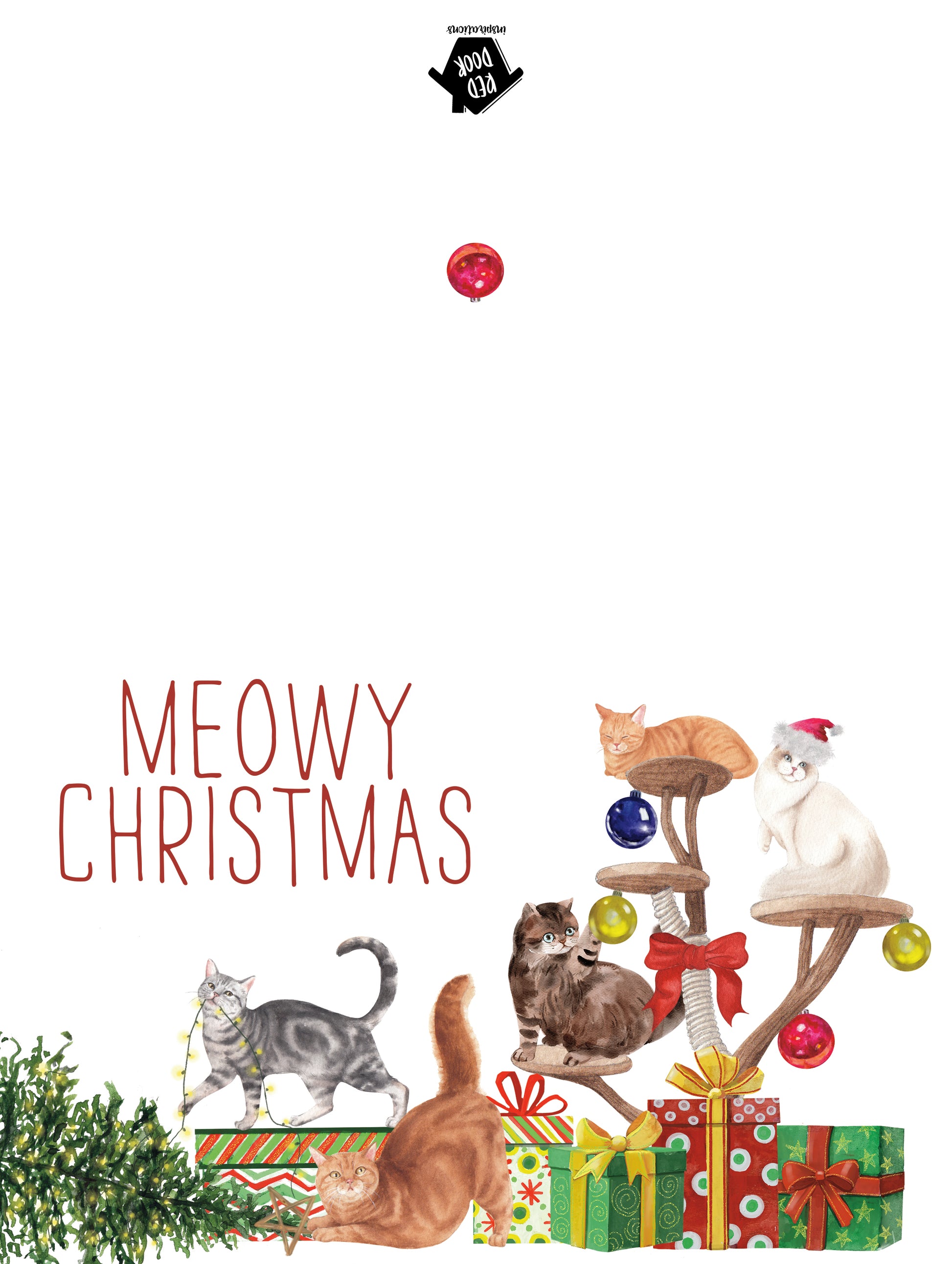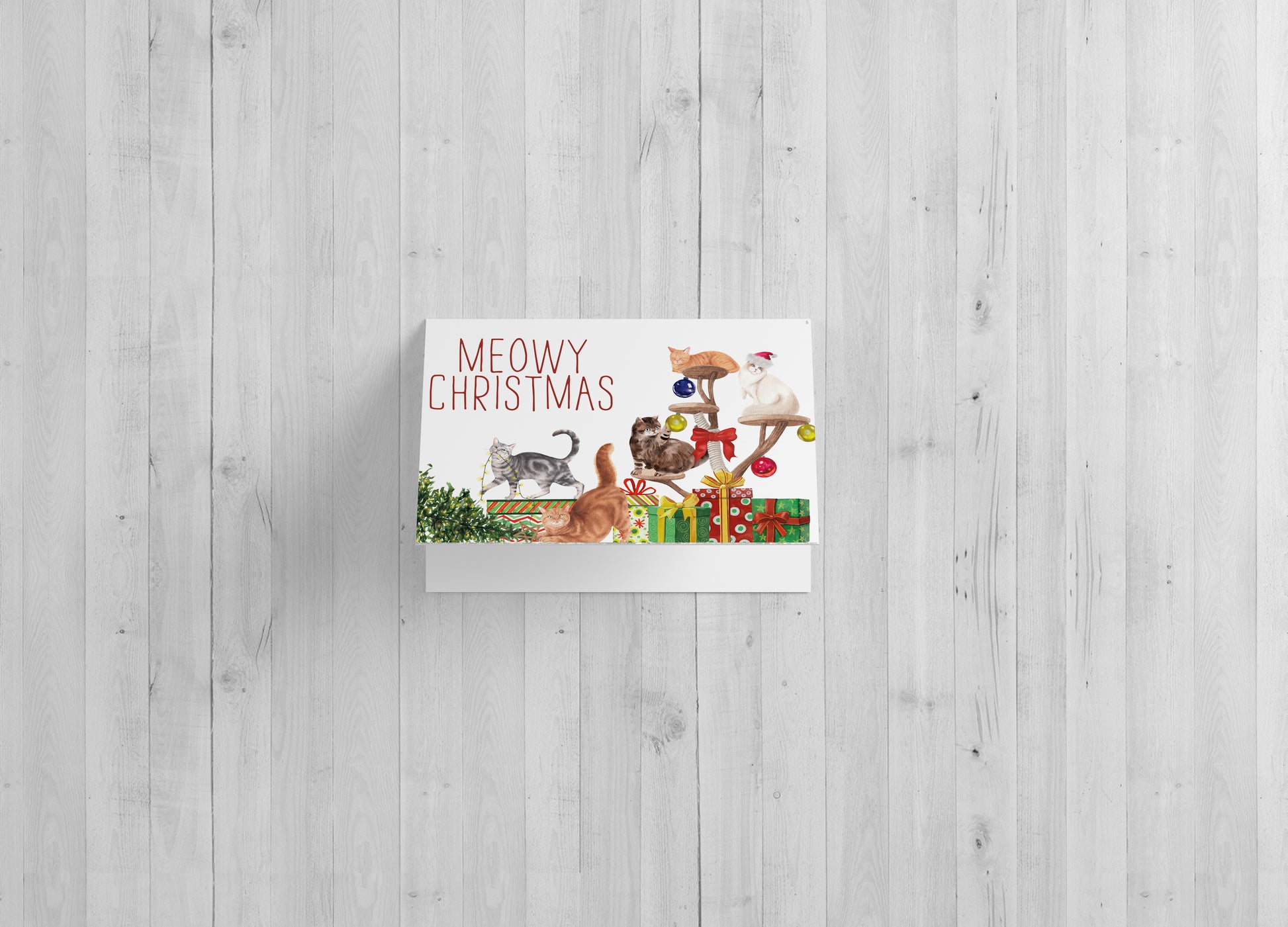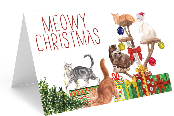 When the people are away, the cats will play! Send this fun Meowy Christmas card to all the cat lovers on your Christmas list! The outside of the card features cats who have disassembled the Christmas tree to create their own Christmas decorations. The creating "Meowy Christmas" is on the front. The inside of the card has the message, "Have a warm and cozy holiday". There is still plenty of room for your own personal note. The 4"x 6" card is printed on uncoated card stock. The cards will arrive flat, but are pre-scored for easy folding. Made in the USA!