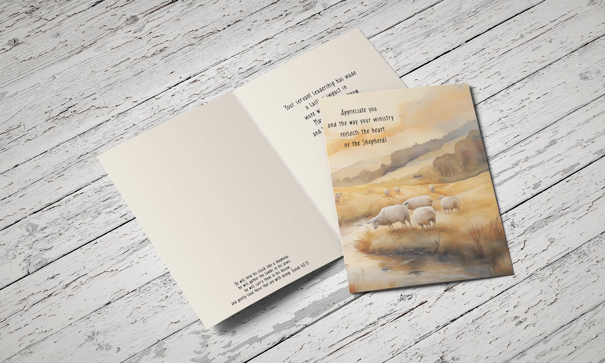 - Encouraging Scripture Inside: Includes Isaiah 40:11, celebrating the Lord’s gentle leadership and care for His flock. The heartfelt message acknowledges the recipient’s servant leadership and prays for refreshment and blessing.