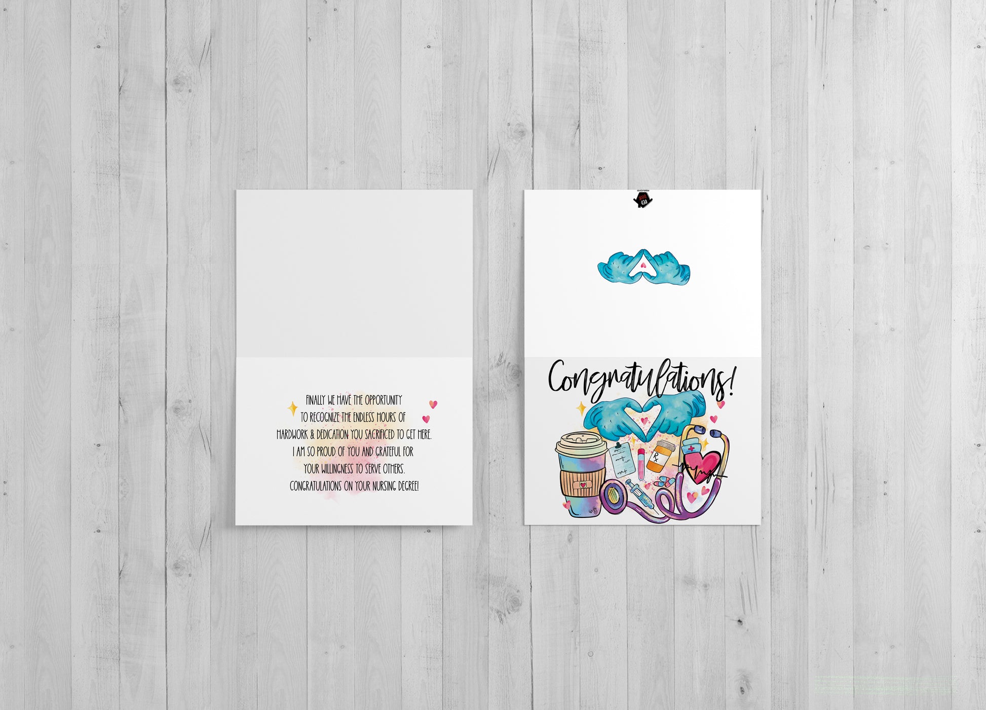 Celebrate the countless hours of study and perseverance by sending this card to the new nursing grad in your life. The outside of the card is a colorful design is filled with nursing necessities while the inside of the card has a message recognizing the sacrifices made and dedication to serving others. The card is 5x7 inches and is printed on card stock. Includes card and envelope. Made in the USA!