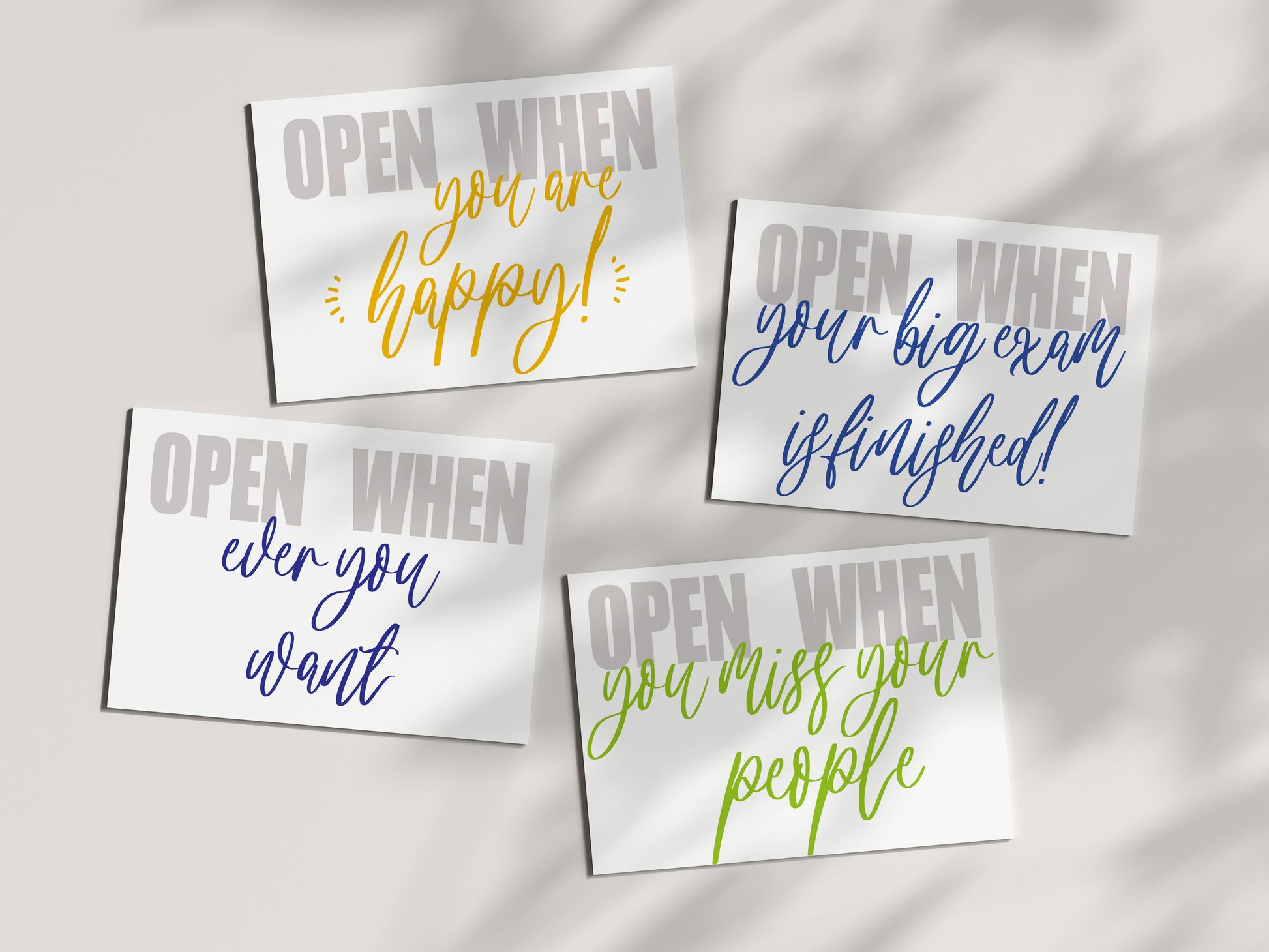 Celebrate the student in your life as they move through the college years with these Open When Envelopes. The little "happies" from home help bridge the distance and let them know you are thinking of them as they are gaining their independence. Large 5x7 inch envelopes are the perfect size for including a small gift, note, or picture. This set includes 10 envelopes, 10 blank cards, and an idea card to help get you going!