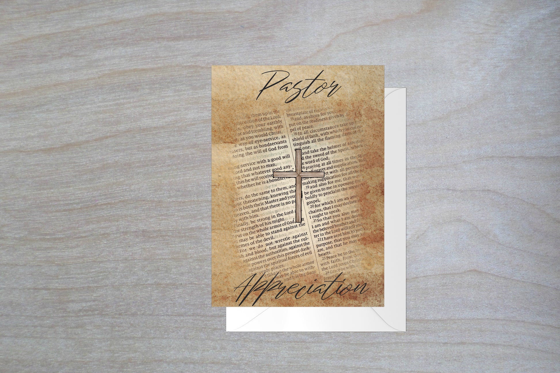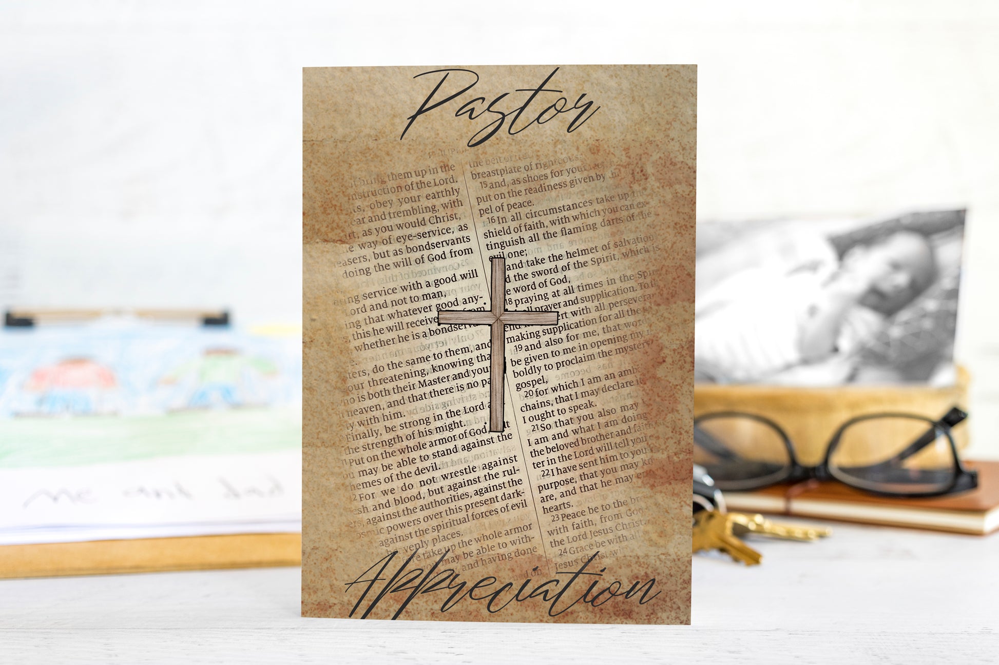 Celebrate the calling of God on the life of your pastor as they serve the God through their service to the church. Our 5x7 inch Pastor Appreciation card expresses appreciation for the many hats they wear. The outside of the card is antiqued with a page from the Bible. The inside of the card has the message, "You are a gift to the congregation! We are grateful for the way you love God's Word, shepherd your flock, serve the community, and stand on the Solid Rock. From life's happiest moments to most difficult days, your care, leadership, and dedication to truth have not wavered. You are a faithful servant to the Lord and we are eternally grateful for you!" Printed on card stock. Made in the USA!
