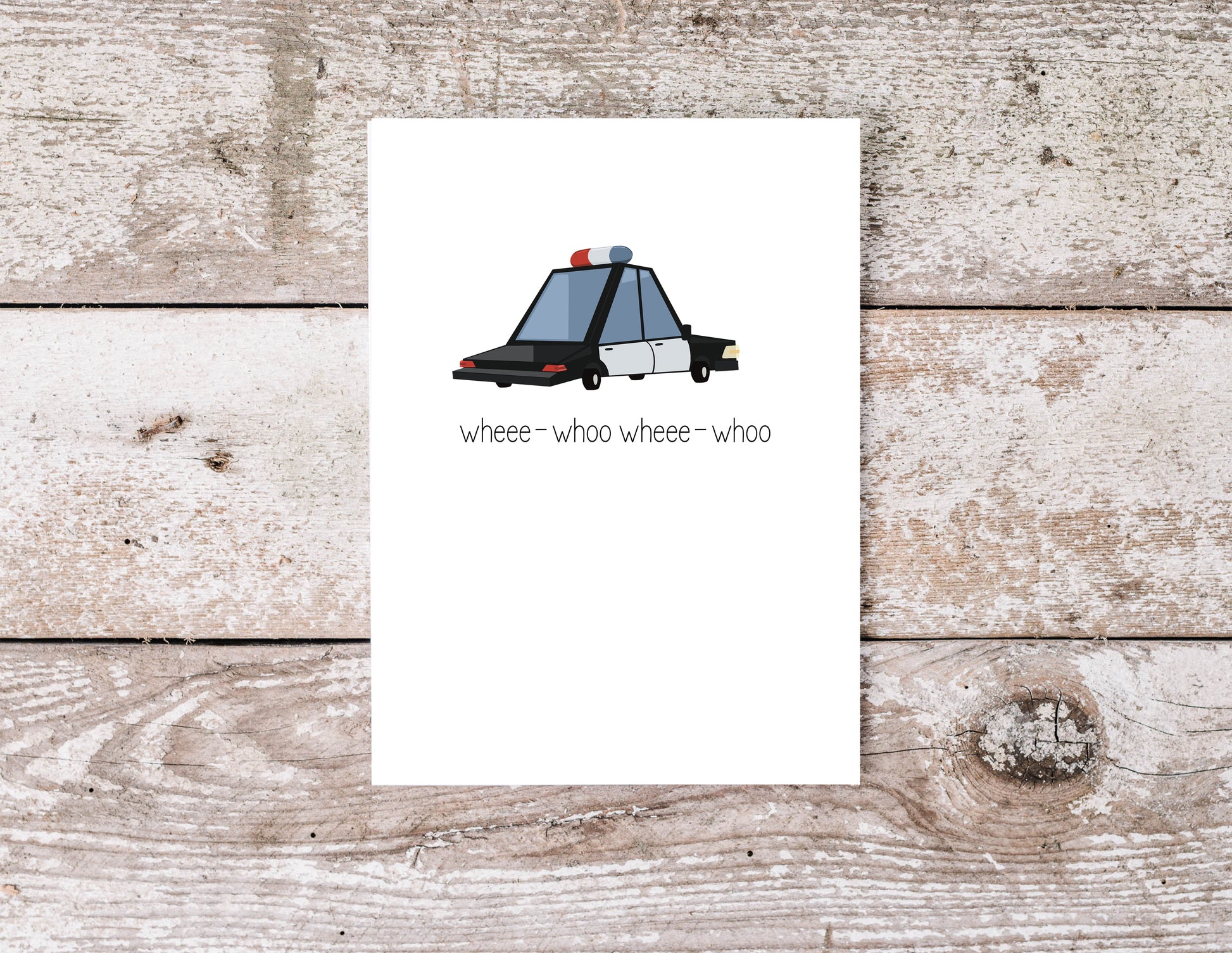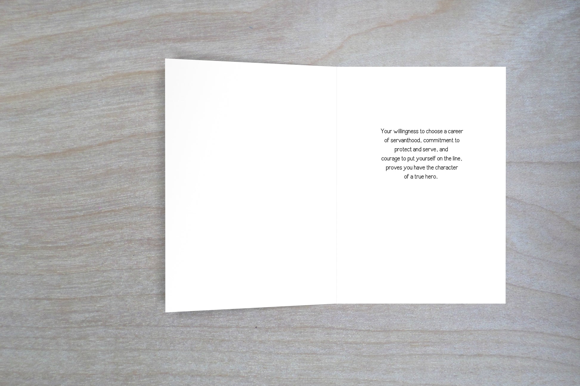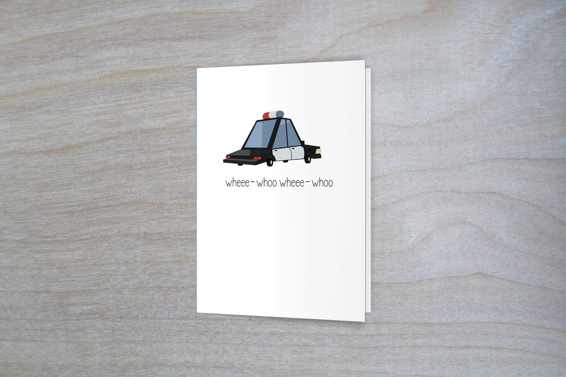 This fun, versatile police card can be used for Police Acadmey Graduation, Police Retirement, or for any police officer in between. The outside of the card has a cartoon Police Card with the siren noise spelled out, "whee-who whee-who". The inside of the card has the message, "Your willingness to choose a career of servanthood, commitment to protect and serve, and courage to put yourself on the line, proves you have the character of a true hero." 5x7 inch card is printed on card stock. Includes single card and envelope. Made in the USA!