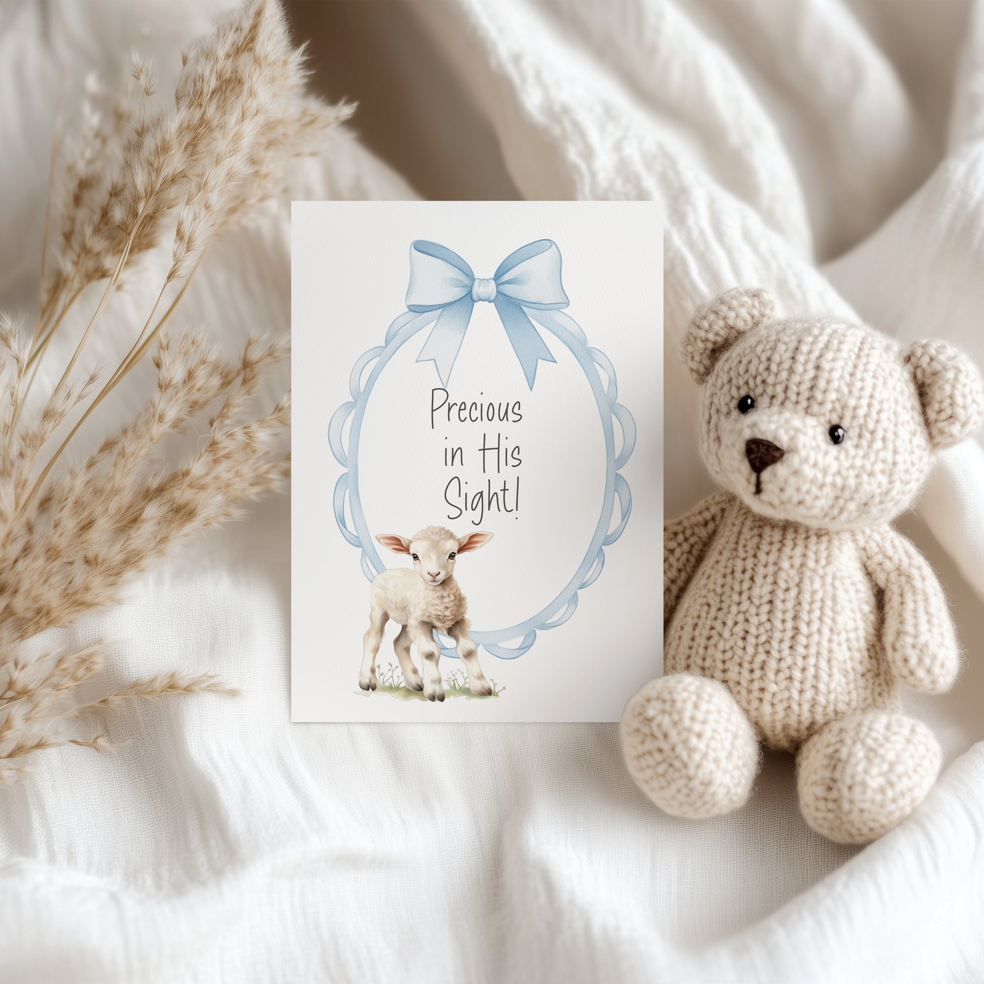 - 🐑 Faith-Inspired Design: Features a tender lamb and blue bow with the message “Precious in His Sight”, perfect for baptism, dedication, or christening.