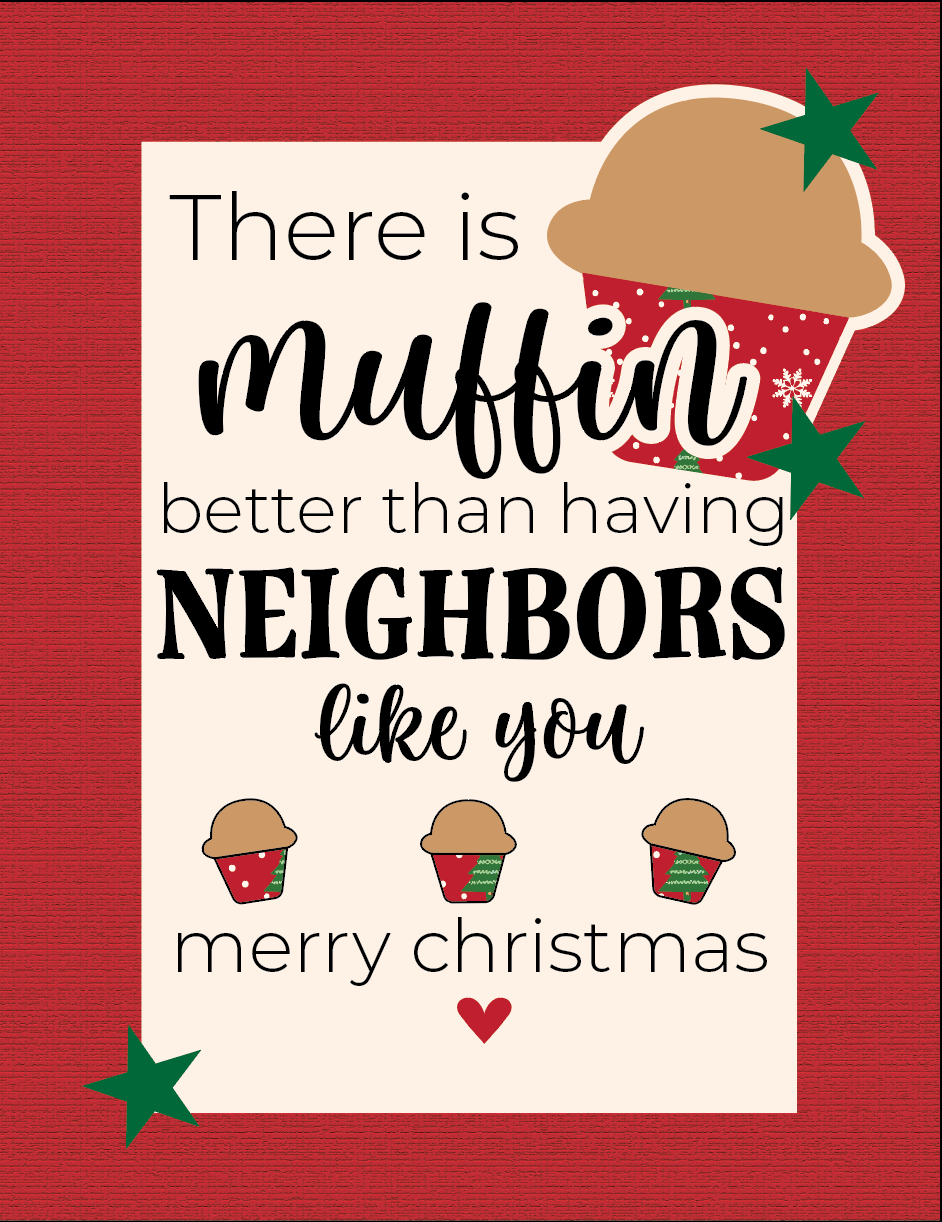 Bring Christmas Cheer to your neighborhood this year by pairing a muffin mix along with Red Door Inspirations' Muffin Tag. This free printable tag says, "there is muffin better than having neighbors like you". Personalize the tag by signing your name in the space under the heart.