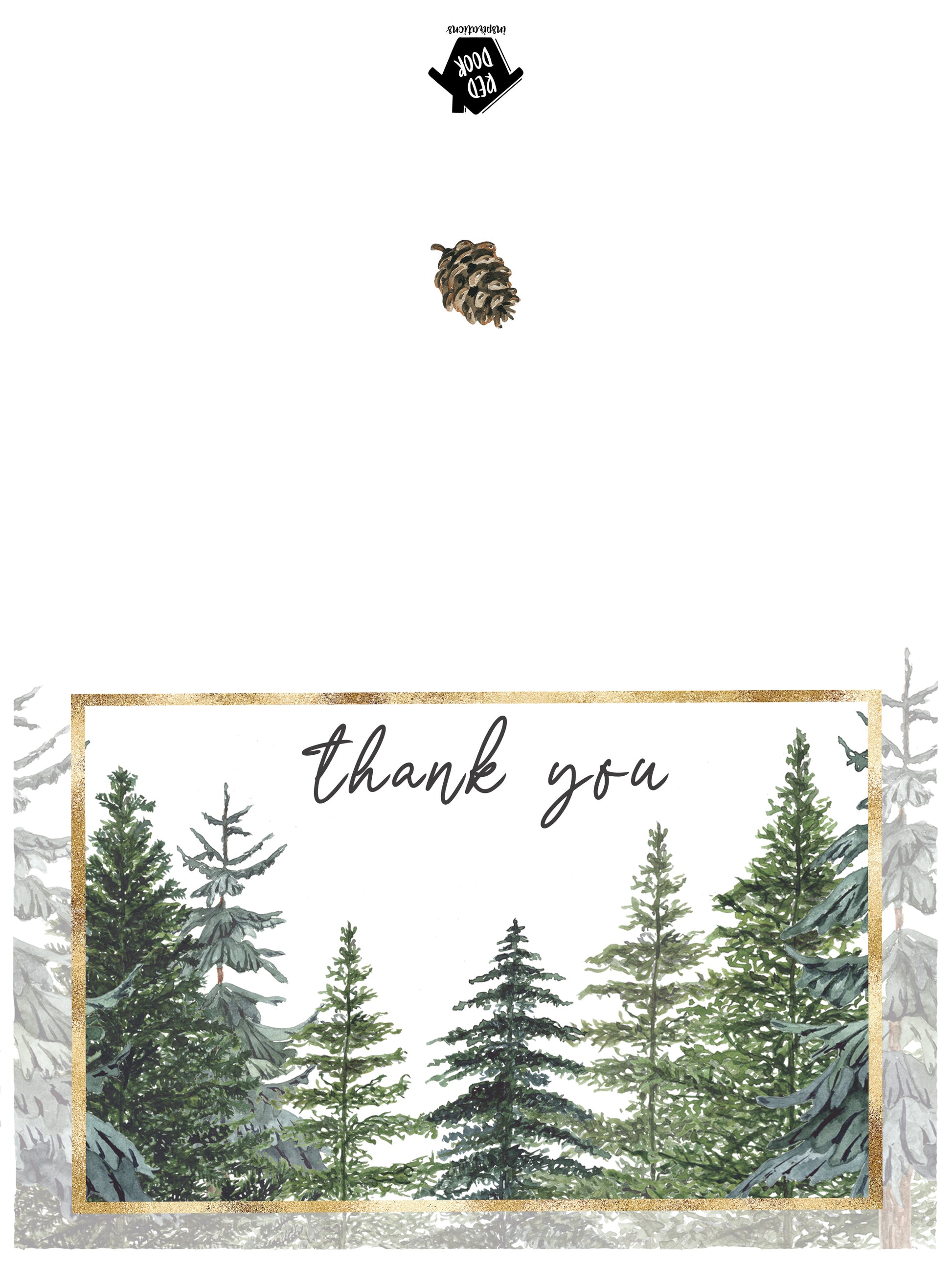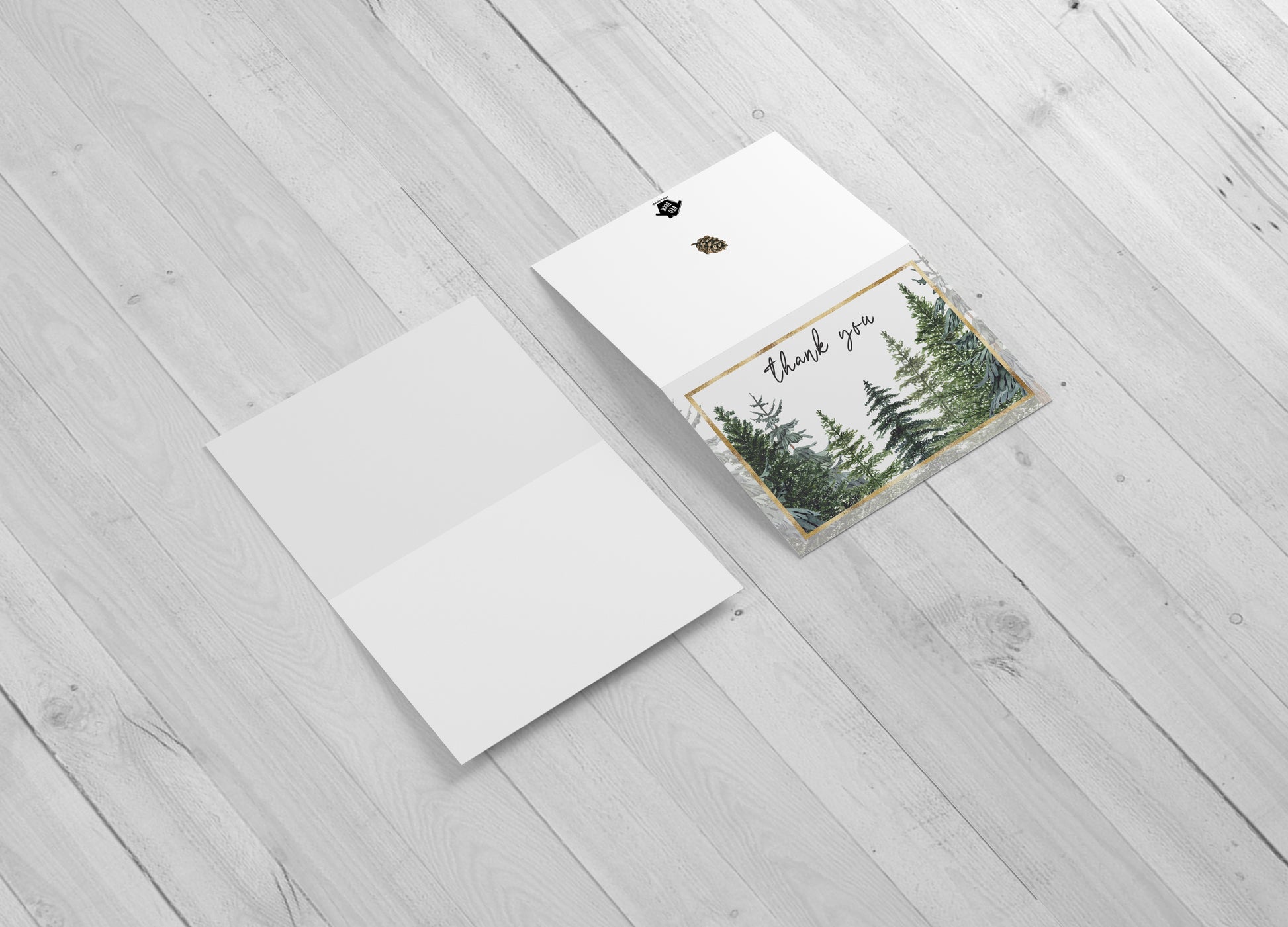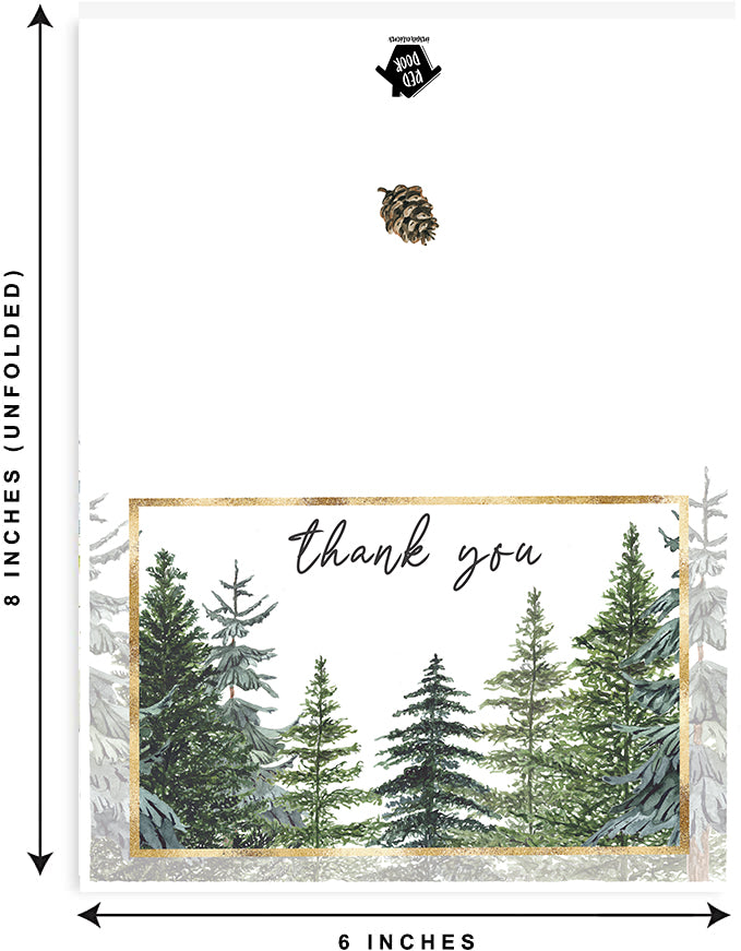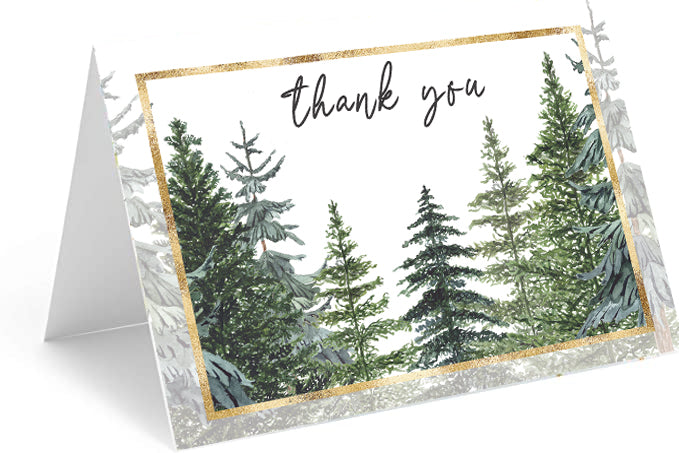 Express your thanks with this simplistic, nature thank you card. Featuring evergreens encased in a gold (not foil) frame and the words "Thank you," the outside of the card has a gloss coating. The inside of the card is uncoated for easy writing and is blank so you can add your own personal message of gratitude. There are 25 4" x 6" cards in each pack and 25 envelopes. The thank you note card has a versatile design that could be used for wedding appreciation, baby shower thank you cards, or everyday gratitude. Made in the USA!